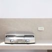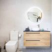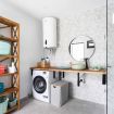 - Un baño completo con inodoro, ducha de lluvia y normal, lavabo, espejo, lavadora y zona de almacenaje con un ventanal desde donde se divisa el Teide al ducharse.
