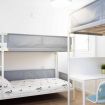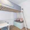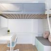 - Habitación triple, con dos camas individuales en literas y una más en mezzanina, con escritorio y sofá en la parte baja de la misma.