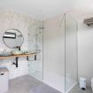 - Fantástico baño con inodoro, ducha de lluvia y normal, cómoda de cajones, espejo y ventana.