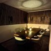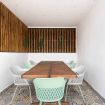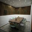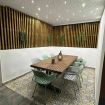 - Preciosa zona de comedor a la sombra con amplia mesa de madera para 8 comensales, banco con almacenaje y techo perforado con led, regulable en intensidad.