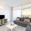 - Salón con sofá, televisión, ventanal con vistas al mar y salida a la terraza.