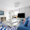 - Salón con dos sofás, butaca, televisión de pantalla plana, ventilador y salida a terraza.